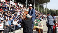Чемпиону мира по борьбе Э.Бакирову подарили 400 тыс. сомов и лошадь – первым сел верхом депутат ЖК. Фото